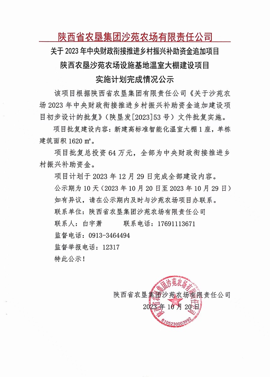 關于2023年中央財政銜接推進鄉村振興補助資金追加項目陜西農墾沙苑農場設施基地溫室大棚建設項目實施計劃完成情況公示