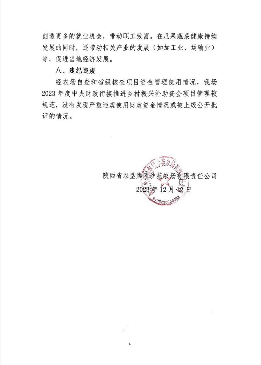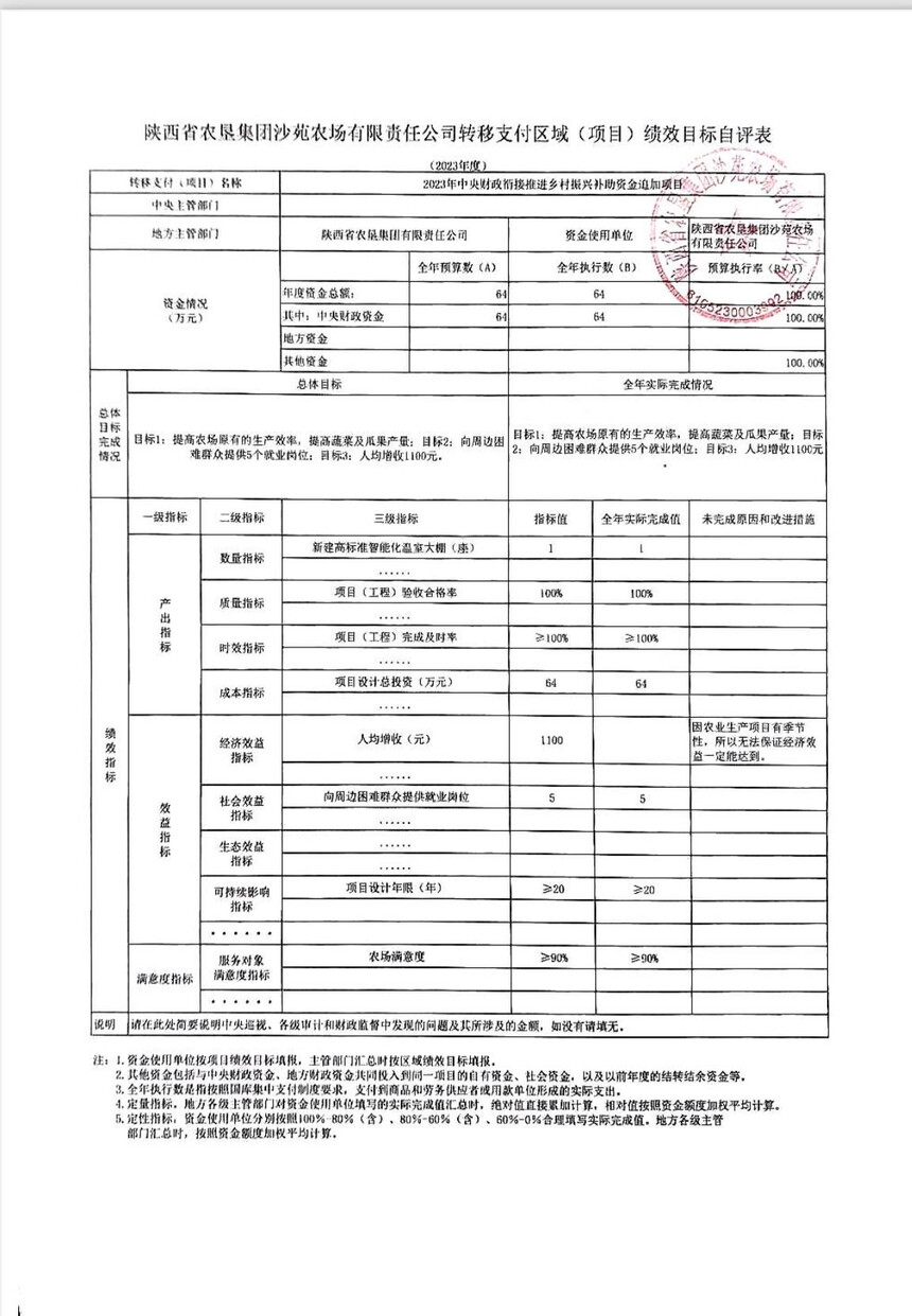 關于2023 年中央財政銜接推進鄉村振興補助資金追加項目 陜⻄農墾沙苑農場設施基地溫室大棚建設項目 績效目標完成情況公示
