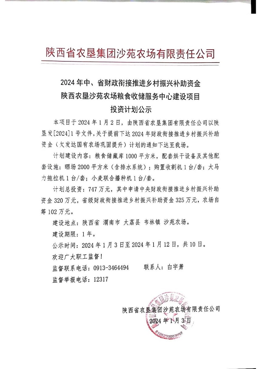 2024年中、省財政銜接推進鄉村振興補助資金陜西農墾沙苑農場糧食收儲服務中心建設項目投資計劃公示