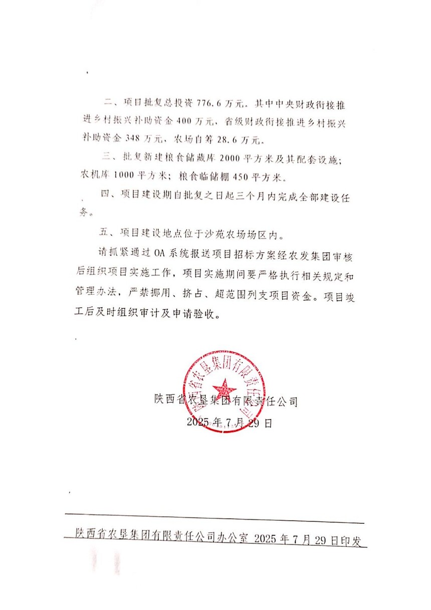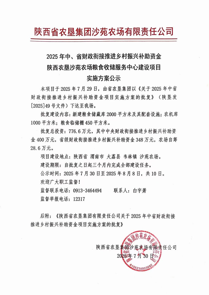 2025年中、省財政銜接推進鄉村振興補助資金陜西農墾沙苑農場糧食收儲服務中心建設項目實施方案公示